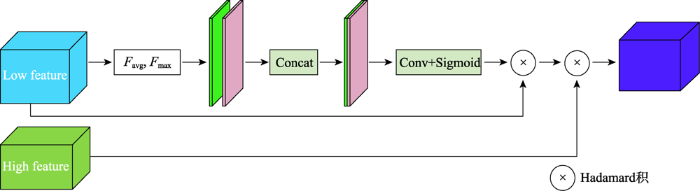 高级特征信息非常丰富,低级语义信息保留了更多细节。通过融合高级特征与低级特征,可以更有效地处理图像的边缘和细节。在DeepLab-v3+[23]中,提出了一种高效的解码结构。SENet提出的SE模块在通道维度上执行聚合操作,这种注意力机制能够更加关注信息量最大的通道特征,同时抑制不重要的通道特征。受到CBAM和SENet的启发,本文提出的PAM模块将高级特征与跳跃层的低级特征通过相应点的像素Hadamard积融合,利用高级信息指导低级信息,从而实现了良好的分割性能。设计结构如图7所示,图7中,“low feature”的蓝色块来自ResNet第二个块的特征图X2,“high feature”绿色块是经过ASPPAM处理后的高级特征图。相应的计算公式如式(9)所示:
