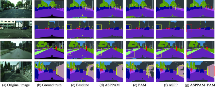 将ASPPAM模块和PAM整合到FCN中进行处理,以分析像素间的依赖关系。本文提出了一种新型结构ASPPAM和PAM,其在Cityscapes验证集上的实验结果如表2所示。为了评估注意力机制的效果,本文分别进行了ASPPAM和PAM的消融实验。实验采用ResNet-baseline作为基准,其中ResNet-baseline的mIoU值为68.1%,FPS(每秒传输帧数)为25帧。在保持ResNet-baseline性能的基础上,引入ASPPAM模块后,模型的mIoU提升至73.8%,较基准模型提高了约5.7个百分点。然而,由于ASPPAM增加了计算负担,导致FPS下降了3帧。相比之下,PAM模块的主要作用是细化边缘和细节,但其对分割性能的提升并不显著。在ResNet-baseline基础上加入PAM模块后,mIoU值达到69.3%,较基准模型提升了1.2个百分点。值得注意的是,PAM模块的计算开销较小,仅导致FPS下降1帧。此外,实验还对比了未进行任何改进的ASPP模块,其mIoU值为70.7%,FPS为23帧。综合实验结果表明,ASPPAM模块在场景分割任务中表现出显著优势,且其对FPS的影响较为有限。基于计算成本考量,最终选择使用下采样率为8的ResNet-101作为主干网络。表2中的所有结果均来源于Cityscapes官方提供的Cityspacescripts工具包计算得出。