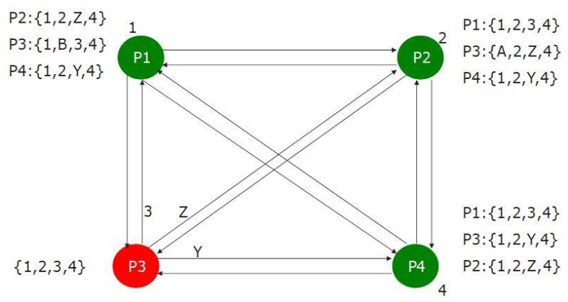 下文通过数学公式进行详细说明:假设P1、P2、P4为正常节点,而P3为故障节点。P1、P2、P3、P4的私有值分别为{1,2,3,4}。P3在第一轮向P1、P2、P4发送了私有值3、Z、Y。以P1接收到的消息为例,P1接收到来自P2的消息向量为{1,2,Z,4},即P2在第一轮向P3发送的P2私有值为2,在第二轮转交给P1的P2私有值为Z及P4私有值为4。同理,P1接收到P3的消息向量为{1,B,3,4},接收到P4的消息向量为{1,2,Y,4}。经过两轮消息传递后,统计P2、P3、P4的消息向量在相同单元位置出现次数超过两次的值,设为ICV元素值,若无则设为NIL。由此可得,P1的ICV为{1,2,NIL,4}。