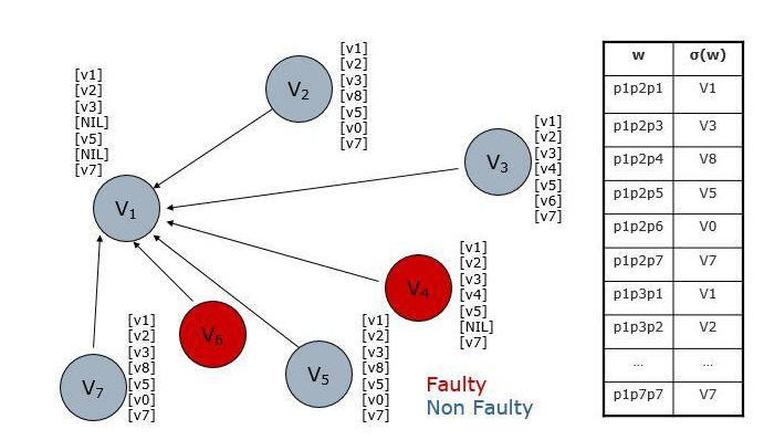 当消息交换完成之后,非故障节点p在其对应的向量位置记录了私有值Vp。对于另外三个节点q的值,则根据接收的三个q的值来确定。其中,一个q的值来自第一轮交换,另外两个q的值来自第二轮交换。如果这三个值中至少有两个是相同的,则采用该相同的数值;如果三个值都不相同,则采用默认值NIL。