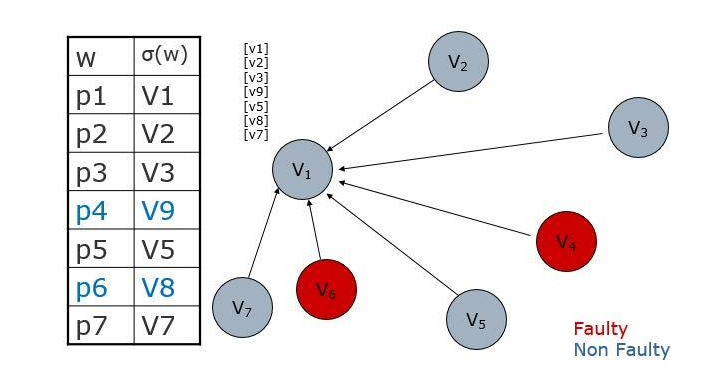 以节点1为例,列举所有满足条件的σ_p (pωq)情况,并进行判断。由此,节点1的向量确定为{V1,V2,V3,NIL,V5,NIL,V7}。对于非故障节点,其向量同样为{V1,V2,V3,NIL,V5,NIL,V7},这表明各节点间达到了交互一致性,达成了最终的协定。