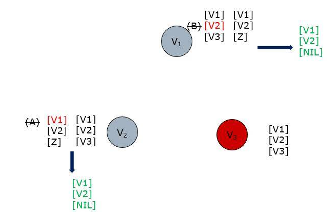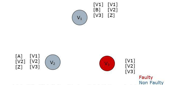 以下是以m=1,n=3为例说明当n<3m+1时无法达成共识。如图所示,节点3为故障节点,节点1和2为正常节点。观察节点1和2的向量,各元素均无明确多数值,例如节点1向量的第二个元素包含一个B和一个V2,没有元素占据绝对优势,因此无法达成共识。