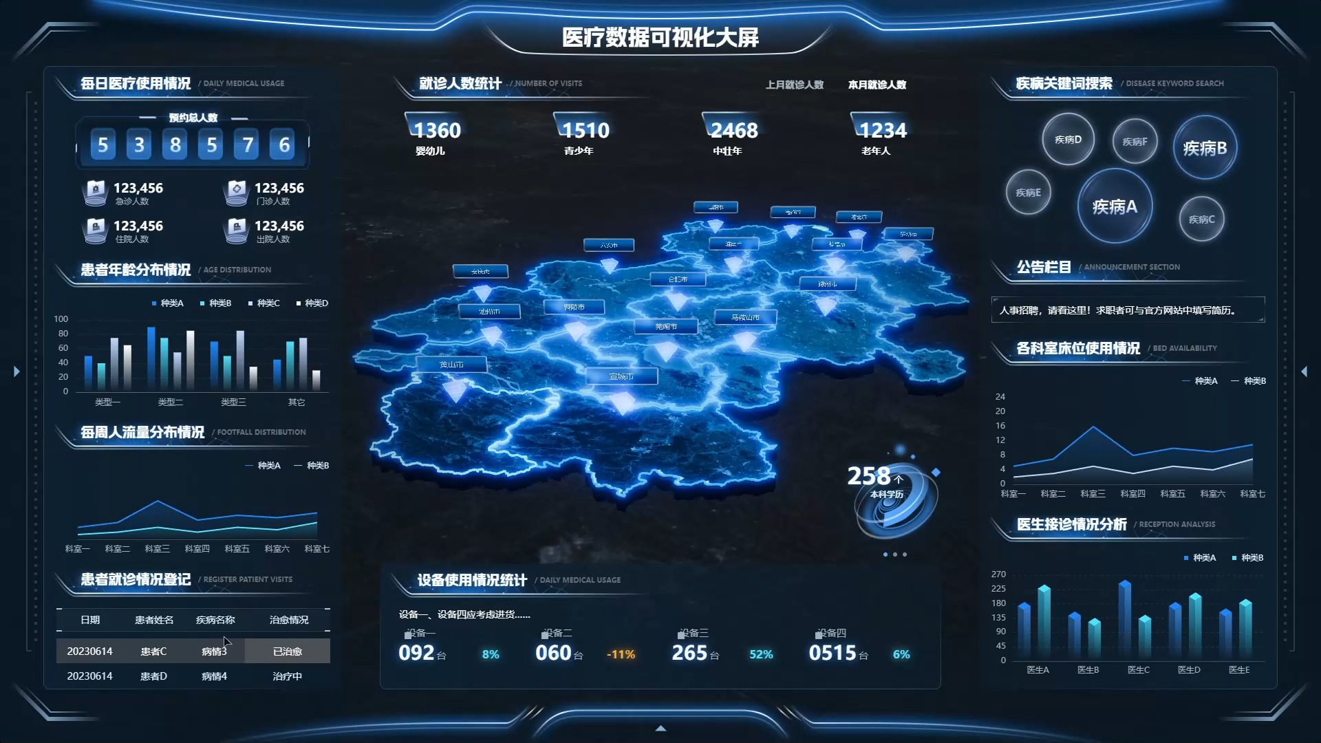 该大屏采用先进的技术手段将海量的医疗数据利用图形、图表和热力图等多种形式进行展示。该系统能够帮助医护人员更加直观地分析各种医疗数据,并显著提高决策效率。
