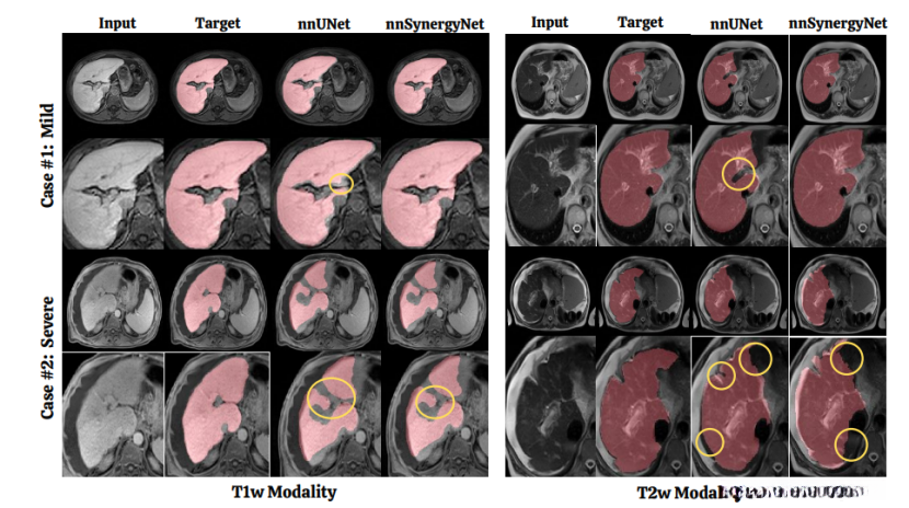 在上图中,展示了T1加权(T1w)和T2加权(T2w)MRI图像的样本结果,显示当前模型在轻度条件下很好地分割了肝硬化肝脏。然而,白色边界表明这些模型在中度至重度病例中由于瘢痕而存在困难。nnSynergyNet3D即使在更高级的病例中也一贯地优于nnUNet和TransUNet,证明了其自动配置加上协同潜在空间设计的优势。