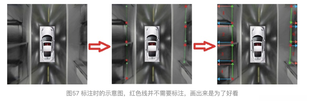 是不是有点像CenterNet?或者YOLO系列,YOLO1/2/3/X,Anchor Free,但是这里最大的区别在于,没有利用图像中的具体像素,利用实例的形状和位置来确定实例,这里就解释不通,因为汽车有畸变,它挡住了车位,并不是真正的实际成像,我们回归可以说是一个二维平面(地面)的车位,而3维空间中的汽车被AVM压到了二维成像中,像素分布并不可靠了,学习图像具体的像素不可行,必须让网络学习抽象的几何表征。有点难以解释,让整个车位的信息,压缩到车位角点,即便车位角点实际并不存在,或者车位角点难以区分,如图58所示。车位角点只是一个承载的载体,也可换到图像中任何其他位置,如进入线AB中点,(没试过),设计的时候考虑到了这一点。