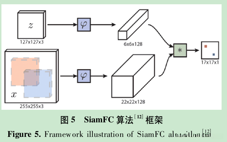 双路网络框架(SiamFC),此方法利用卷积网络提取目标模板和搜索区域的特征,然后再进性相关操作生成响应图,其中响应图上的峰值点就是目标所在的位置。