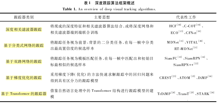基于深度学习的跟踪算法,采用的框架包括相关滤波器、分类式网络、双路网络等。