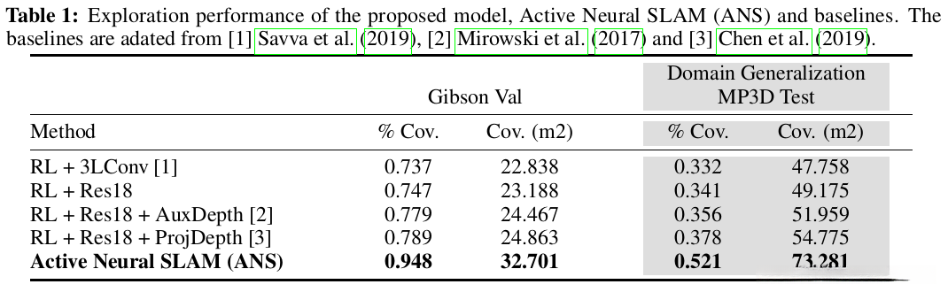 该研究提出了一种结合学习方法与传统方法的 novel exploration framework, 称为 Active Neural SLAM (ANS), 用于室内环境导航与探索任务。该方法通过迁移学习将长期目标转化为短期目标, 并结合神经SLAM模块实现对未知环境的高效导航与空间建模。实验在 Habitat 模拟器和 Gibson 数据集上进行, 采用 PPO 策略进行强化学习训练, 并通过多组对比实验验证了 ANS 在小场景下对探索效率的显著提升, 同时有效避免了传统方法在大场景中的局部最优问题。此外, 该框架还适用于目标点导航任务, 在 CVPR 2019 挑战赛中取得了优异成绩。
