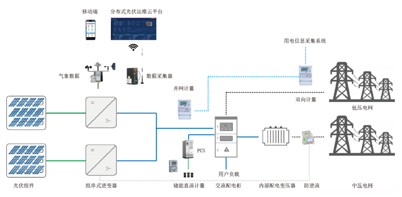 光伏阵列接入组串式光伏逆变器,或者通过汇流箱接入逆变器,然后接入企业380V电网,实现自发自用,余电上网。在380V并网点前需要安装计量电表用于计量光伏发电量,同时在企业电网和公共电网连接处也需要安装双向计量电表,用于计量企业上网电量,数据均应上传供电部门用电信息采集系统,用于光伏发电补贴和上网电量结算。