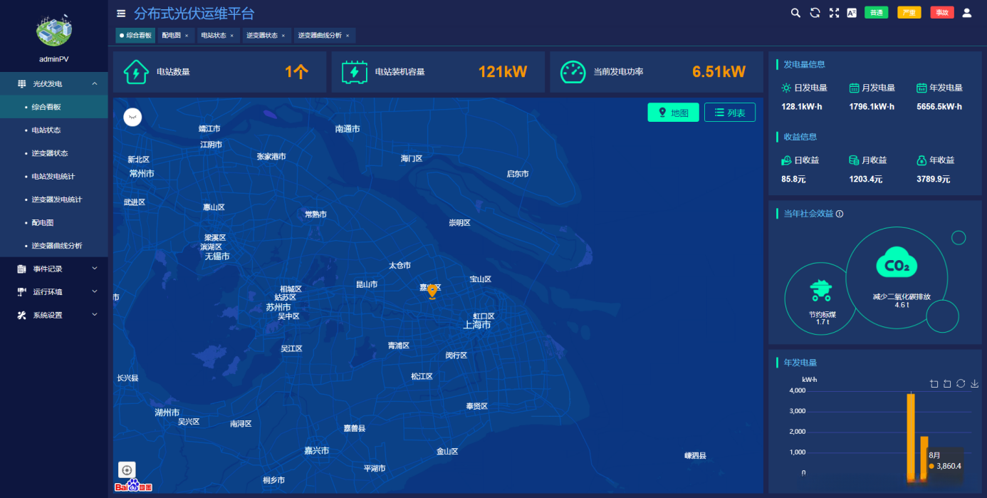 ●显示所有光伏电站的数量,装机容量,实时发电功率。