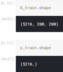 请允许我们回顾一下X_train和X_test这两个数组。它们的形状分别为(5216, 200, 200)和(624, 200, 200),关键在于了解这些结构特征。