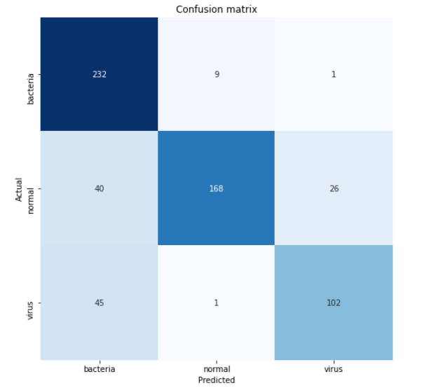 根据上述混淆矩阵分析可知,在X射线图像识别任务中我们观察到有45幅感染病毒的影像被系统误判为细菌类别这可能与两类疾病之间的相似性有关然而我们仍能从成功地将其中的232个样本(占总测试数据量96%)正确分类这一事实中看出我们的模型在预测细菌引发肺炎方面表现出了较高的准确性