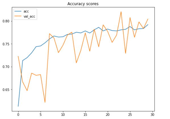 163/163 [==============================] - 17s 104ms/step - loss: 0.4915 - acc: 0.7922 - val_loss: 0.7079 - val_acc: 0.8045