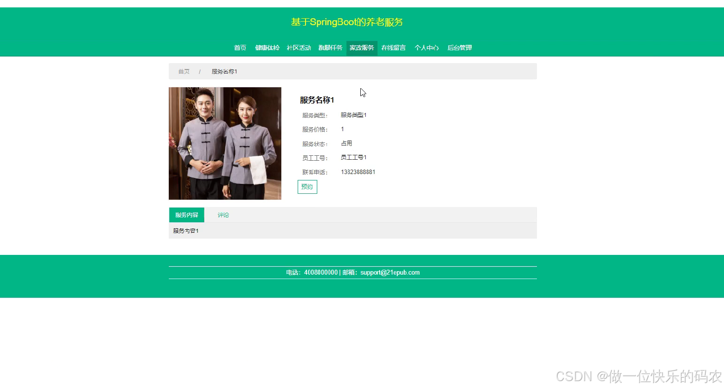 With the rapid development of science and technology, all aspects of society and all walks of life are trying to integrate with modern advanced technology and improve their own advantages through scientific and technological means. Of course, elderly care services cannot be excluded. From the statistics and analysis of physical examination and physical examination appointment, a large number of and various kinds of data will be generated in the process. This paper takes the elderly care service as the goal, adopts B / S mode, takes springboot as the development framework, Java as the development language, eclipse as the development tool, and MySQL as the data management platform to realize the functions of elderly care service, including the elderly, service personnel, elderly files, physical examination, physical examination appointment, community activities, activity registration, errand running tasks, task evaluation, online message, housekeeping services and so on.