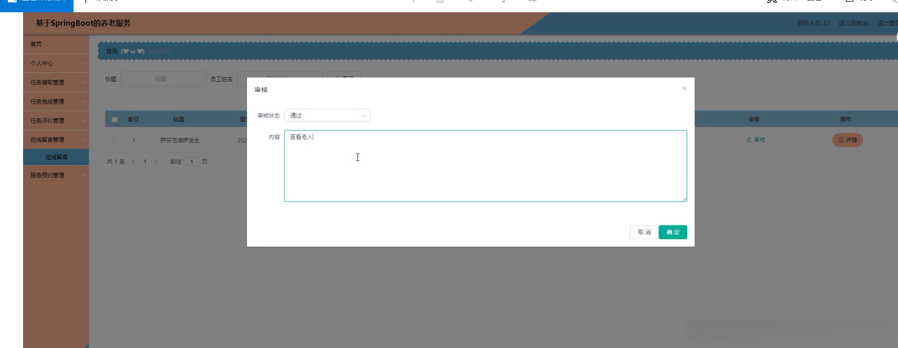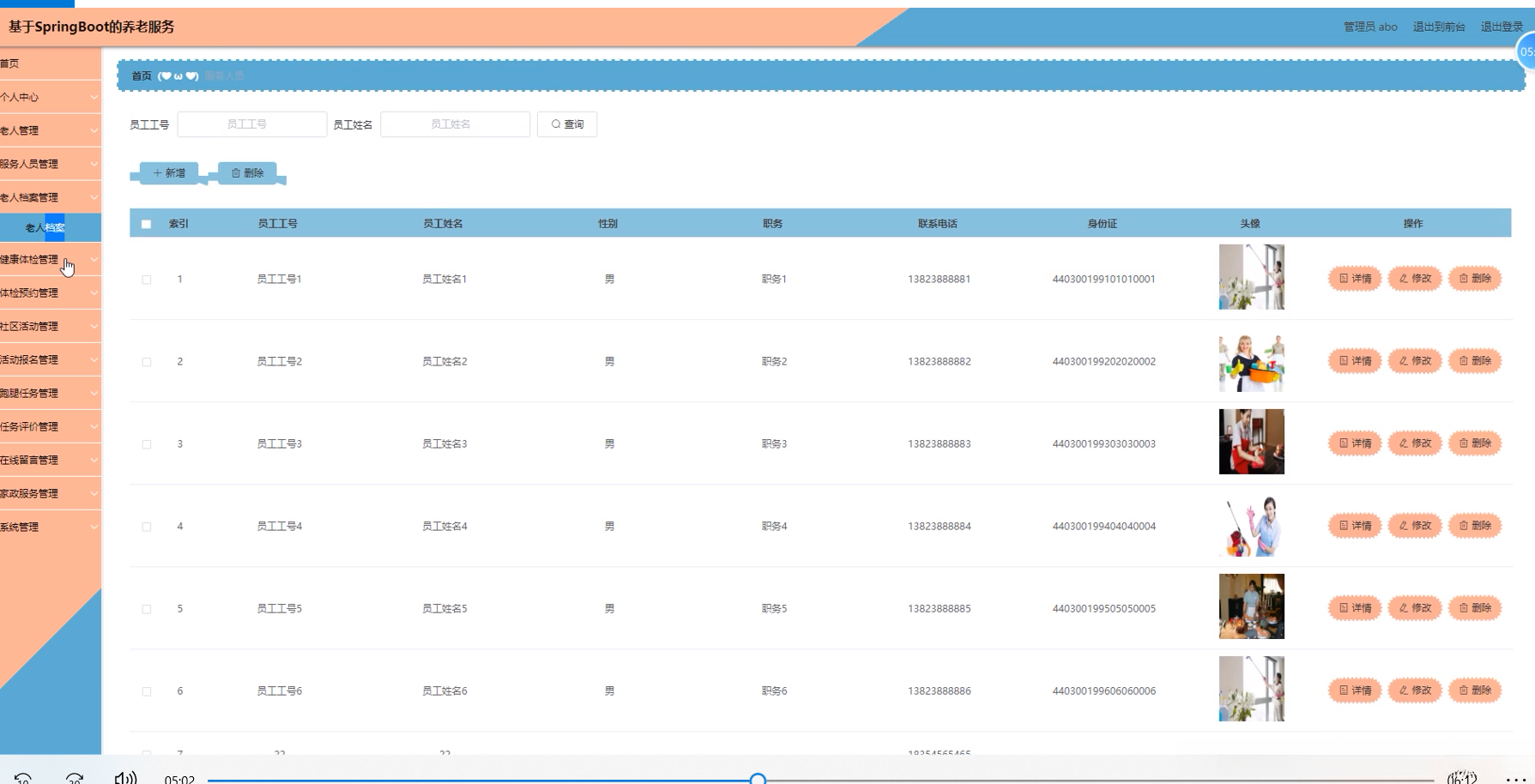 (4)在老人、服务人员、老人档案、健康体检、体检预约、社区活动、活动报名、跑腿任务、任务评价、在线留言、家政服务等模块,管理员可以对这些模块进行新增、修改、删除等操作。