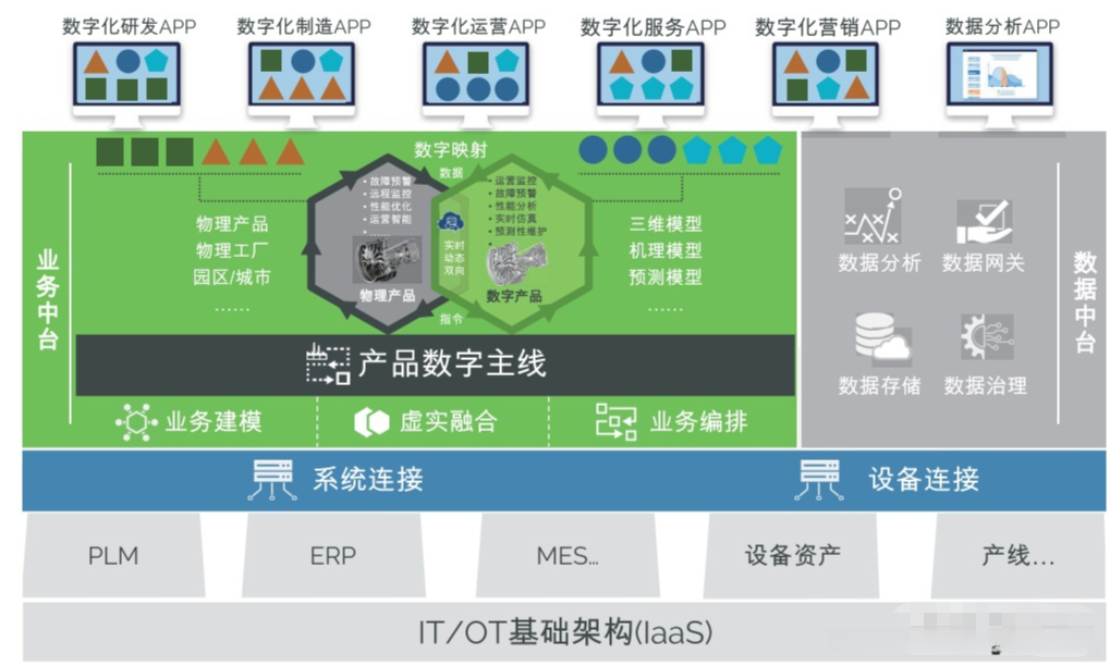 遵循前、中、后台分层架构的指导原则,以中台为核心,构建了工业企业数字化业务体系。该体系不仅实现了纵向和横向的集成,其中纵向集成指IT/OT集成,横向集成则涉及全寿命周期价值链整合。通过这一架构,构建了以数据驱动的创新业务模式。
