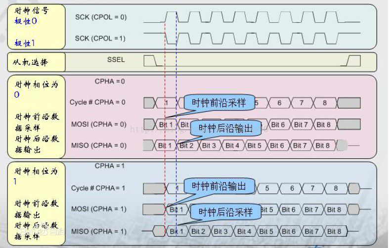通过上述CPOL和CPHA的两两搭配组合出了四种工作模式,可看下图所示