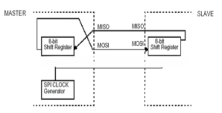 SPI通信协议的信息以逐位的方式进行发送/接收,并需要注意的是:SPI总线采用的是一个环形结构,在SCLK调控下两个双向移位寄存器进行数据交换。具体而言,在主机向从机发送一个数据包时也会同步接收到一个反馈数据包,并确保双方能够完成一次完整的移位操作;其环形通信过程如下所述:当主机向从机发送一位数据时会即时接收到从机的一位响应信号;同时在每次完整的循环往复中都能保证双方信息的有效同步与互换