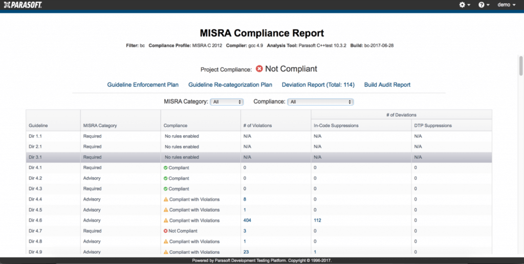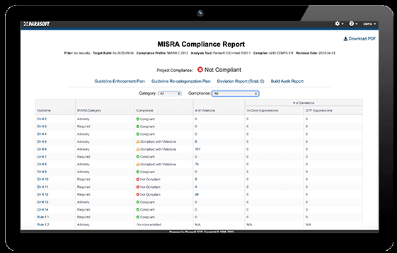 从Parasoft的MISRA Compliance Pack中快速获取高级概述和详细报告,以有效地展示合规性。