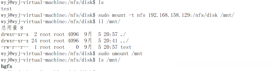 wyj@wyj-virtual-machine:/nfs/disk$ sudo mount -t nfs 192.168.158.129:/nfs/disk /mnt/