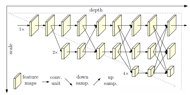 (2)本文提出的模型融合相同深度和相似级别的低分辨率特征图来提高高分辨率的特征图的表示效果,并进行重复的多尺度融合。