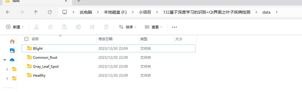数据集放在data文件夹下,共4个叶子疾病:'枯萎病','普通锈病','灰色叶斑','健康'