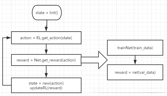 action = RLnet.get_action(state) # 强化学习网络根据当前状态获取下一步的动作,其中是使用原论文所给的NAScell来对动作进行预测的。