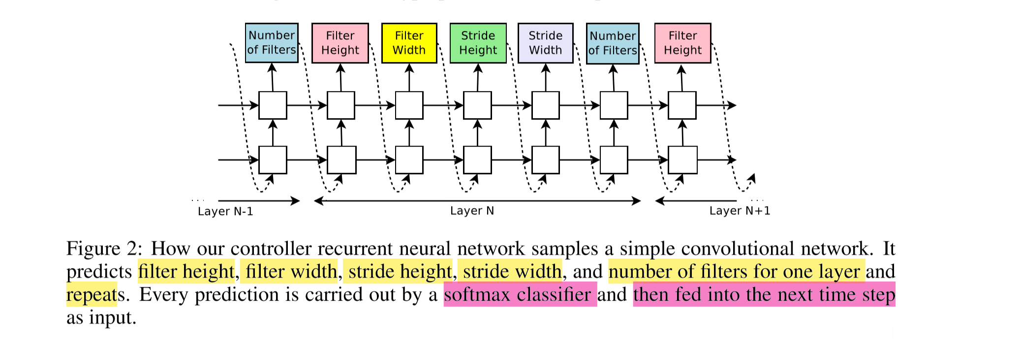 RNN Controller 首先预测 layer type,再预测相关的 hyperparameters