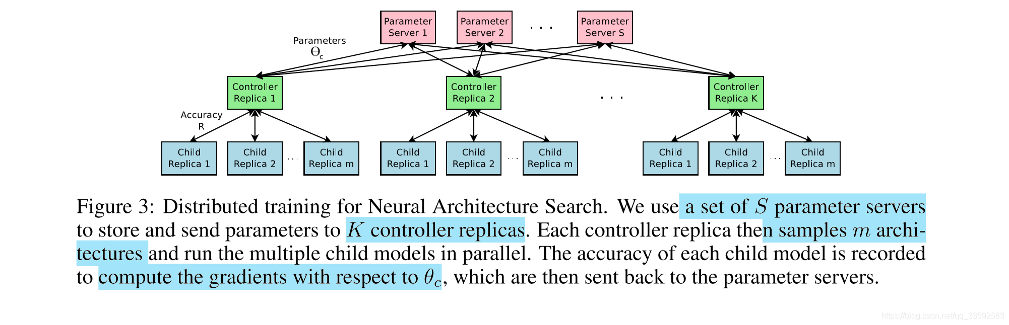 且每次训练收敛耗时长,所以使用 分布式训练和异步参数更新的方法来加速 controller 的学习速度。具体结构如下