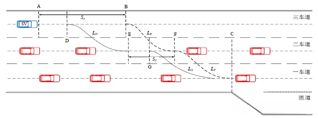 本模型所描述的场景如图3-1 所示,即为最基本的高速公路下匝道强制换道场景,车辆SV 为了以限速驶入匝道出口减速车道,必须在C 点或C 点之前从高速车道换道至低速车道。B 点即为最晚的换道起点,LB 为三车道最晚换道轨迹,LF 为二车道最晚换道轨迹,LD、LG 为实际换道轨迹。为了确定换道车辆SV 剩余的换道准备时间T,首先需要进行换道轨迹全局优化,也就是确定B 点位置,此处的轨迹规划方法将在第四章详细介绍。假设A 点为车辆的换道意图生成点,则车辆SV 在A 点处开始寻找适合的车头时距。本模型的核心便在于建立换道意图生成点位置与换道成功率的函数关系。