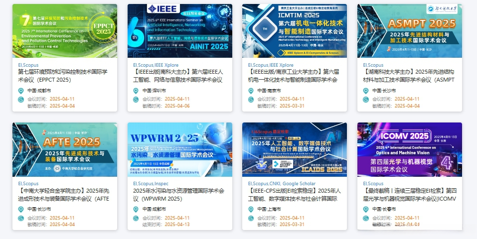 2025年4月必参加的学术会议推荐!制造技术、材料、计算机科学、航天航空、艺术教育管理、信息科学、能源电力、物理学、交通运输、自动化、城市规划、电子电气工程、物联网、光电科学等领域多主题可选!...