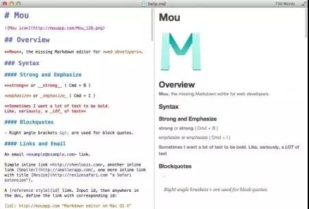 实时的代码修正:开发者在Mou的左栏写Markdown代码,右侧就能实时显示输出效果,从而能实时地为开发者检查代码的正确性。