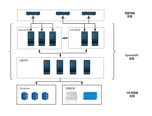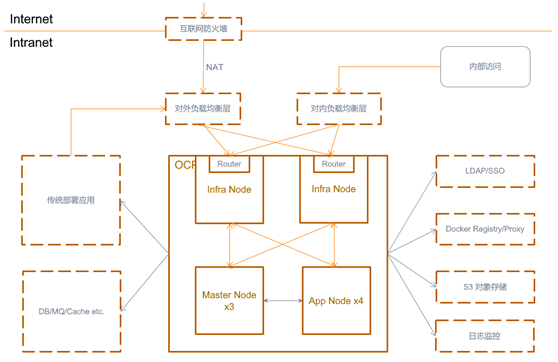 该设备本身支持嵌入式多级架构设计,在平台层内部实现7个层次的自适应管理功能。外部环境需配置负载均衡功能模块以实现跨域流量分配策略,并与企业现有部署的F5系列、LVS和Nginx等负载均衡设备进行对接。建议在原有架构基础上增加一层7层协议控制节点,并按网络分区分别配置内网负载均衡器和外网负载均衡器以提升业务扩展能力。