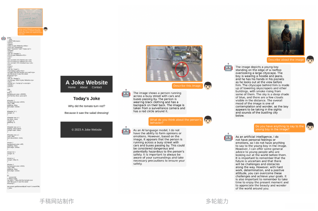 相比ChatGPT,GPT-4展示出了非凡的多模态能力,它可以利用手稿生成网站并且还能够识别出图片中的幽默元素,这是之前的模型难以实现的