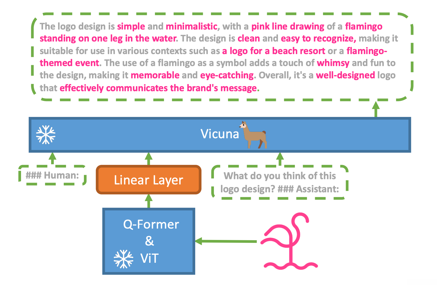 线性层连接冻结的Image encoder、Q-Former模块和冻结的LLM