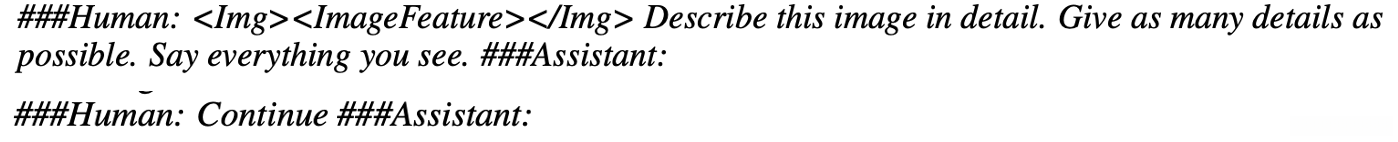 训练流程:整理prompt set,例如“Describe this image in detail” 等,随机采样prompt填入下面模版训练,模型全量训练