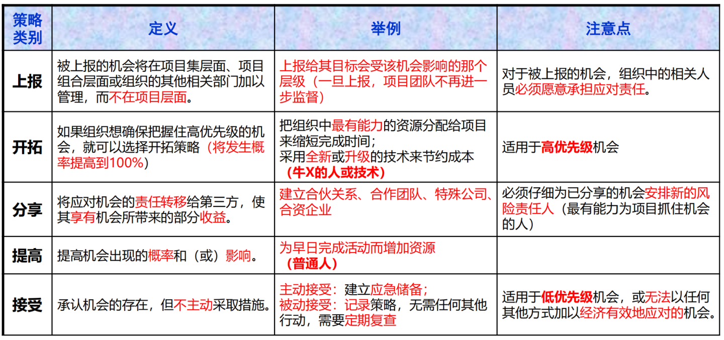 ⚫ 规划风险应对—工具与技术:机会应对策略(P444)