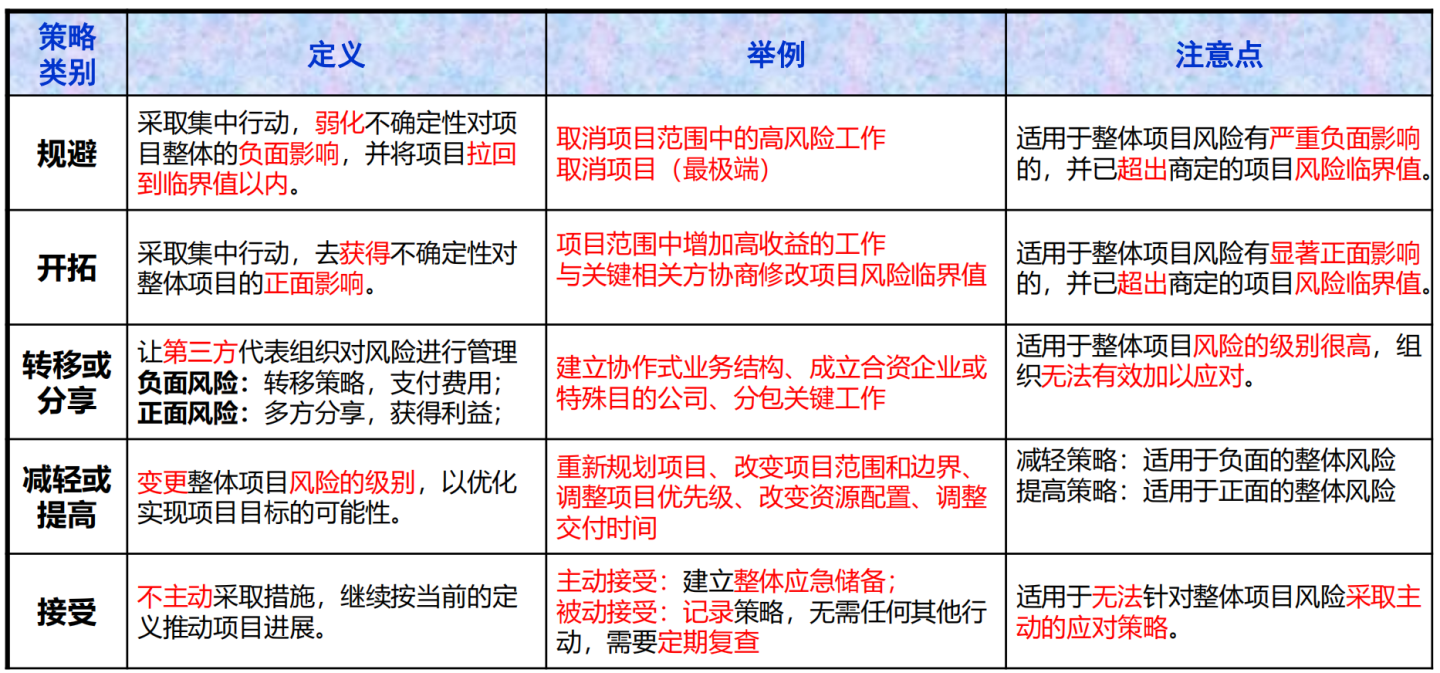 ⚫ 规划风险应对—工具与技术:整体项目风险应对策略(P445)