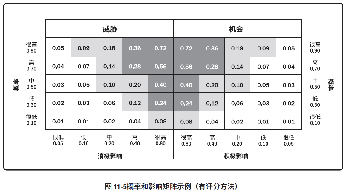◆ 概率和影响矩阵:把每个风险发生的概率和一旦发生对项目目标的影响映射起来的表格。通常由组织来设定概率和影响的各种组合,并据此设定高、中、低风险级别。