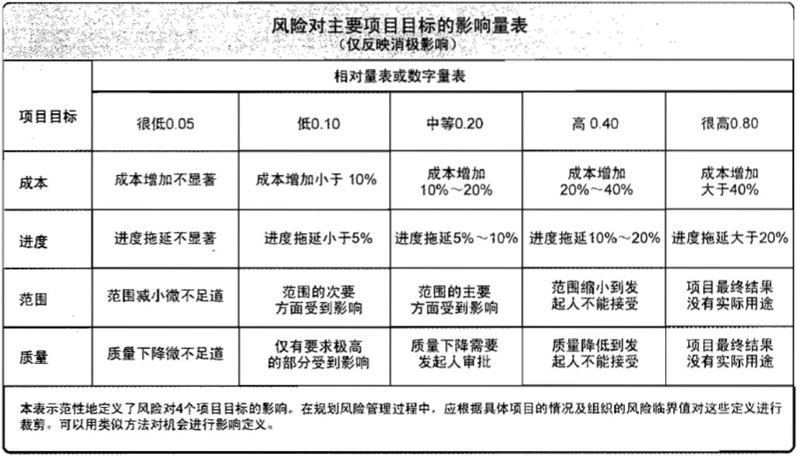 ◆ 风险概率和影响定义:根据具体的项目环境、组织和关键相关方的风险偏好和临界值,来制定风险概率和影响定义。项目可能自行制定具体定义,或者用组织提供的通用定义作为出发点。