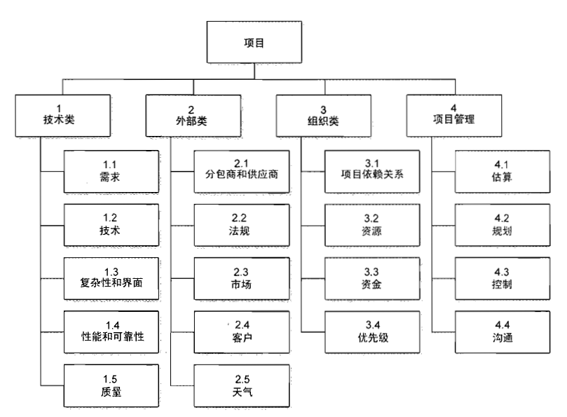 ◆ 风险分解结构(RBS)---- 是潜在风险来源的层级展现。有助于项目团队考虑单个项目风险的全部可能来源,对识别风险或归类已识别风险特别有用。
