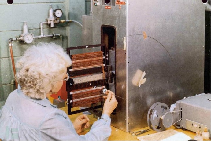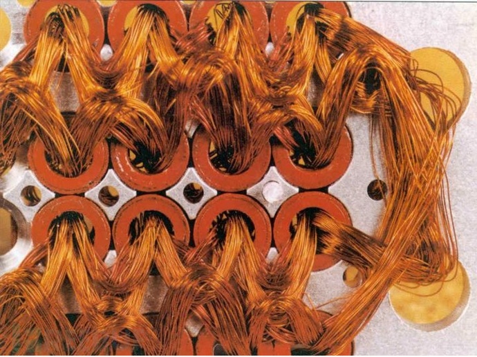 线存储器是一种只读存储器(ROM)。利用磁环改变导线上电压的状态,如果导线穿过磁环,导线上的电压就会发生改变。系统检测到这种改变后,就会把这条导线上的数据解释为1,如果导线没有穿过磁环,那么导线上的电压不发生改变,系统就会把这条导线上的数据解释为0。线存储器如图7-11所示。