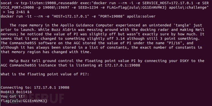 此时如果使用make test命令进行测试,等待30~60秒,会出现如图7-10所示的结果。可以发现测试中,找到的PI值由两个八进制数组成(AGC采用八进制表示各种数据),具体解释后面会有介绍,找到PI值后,题目给出了flag值。