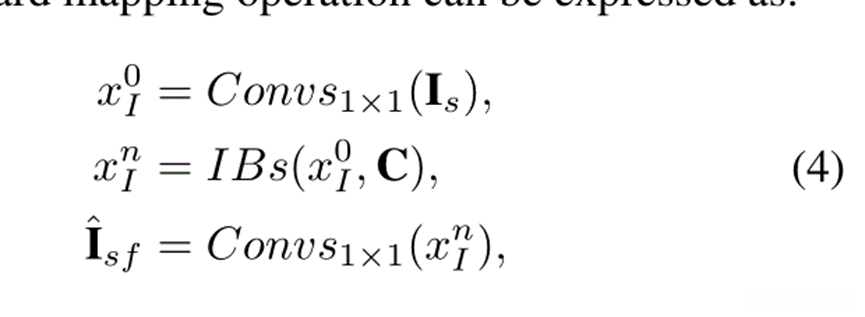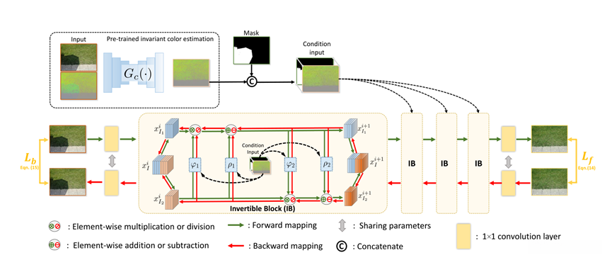 在前向映射的过程中,BMNet接收输入为阴影图像Is,并基于条件信息从Is到其变形后的版本ˆIsf建立前向映射关系。研究团队首先通过一个核大小为1×1的标准卷积层提取出浅层特征表示x0I;随后将这些特征与辅助条件信息C(包含阴影遮罩图和颜色图)一起输入到由n个级联构成的可逆块序列(IBs)中进行特征仿射变换;最后通过另一个1×1的标准卷积层生成最终输出ˆIsf。具体而言,在这一过程中我们发现:其中C代表的是阴影掩膜以及我们在论文中所学习得到的一种保持阴影不变的颜色图