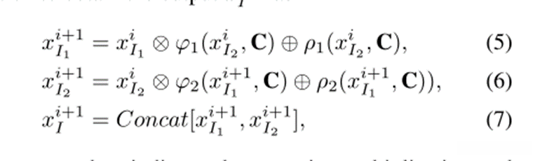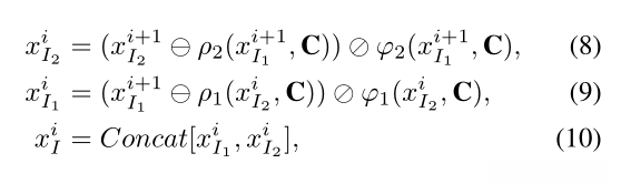 深入第i个可逆块内部后,在通道维度上将输入特征量xiI均匀分割为两部分[xiI1, xiI2]。通过仿生学原理进行转换处理后生成输出特征量xi+1 I。