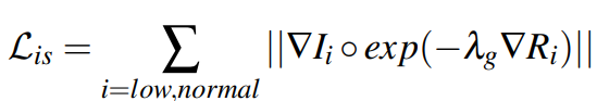 作者认为最佳的光照分量应在纹理细节中相对平滑,并能够较好地维持整体结构的边界。当直接采用TV损失时(即TV损失存在结构性盲点问题),因为该损失计算的是全局梯度的累加平均值,在面对复杂场景或强烈光照变化时会显著增加误差(此处强调了其局限性)。此外(因为)光照分量I往往表现出强烈的光线变化趋势(此处补充说明了问题所在),所以为了改善这一缺陷(此处指出改进目标),作者建议利用反射分量R的梯度图来作为权重分配依据。