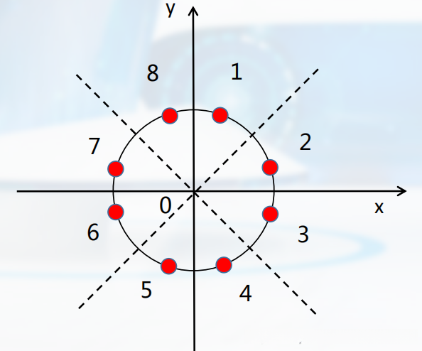 通常使用八分法来绘制圆形图形。考虑到圆形图形的对称性特点,在绘图过程中只需要计算绘制四分之一圆周上相应的像素点即可。如图所示: