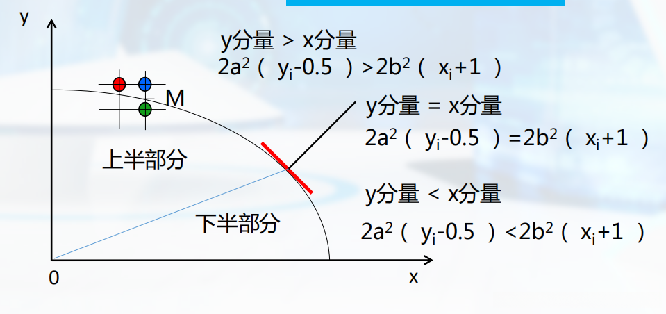 特别地,在处理椭圆时, 我们需要确定其占比为四分之一. 此外, 为了实现目标, 我们必须首先找出关键的分割线, 如下图所示. 在分割线上时, x方向的变化量占主导地位; 而在分割线下方时, 则是y方向的变化量起主导作用. 其他部分的处理方法与此相似.