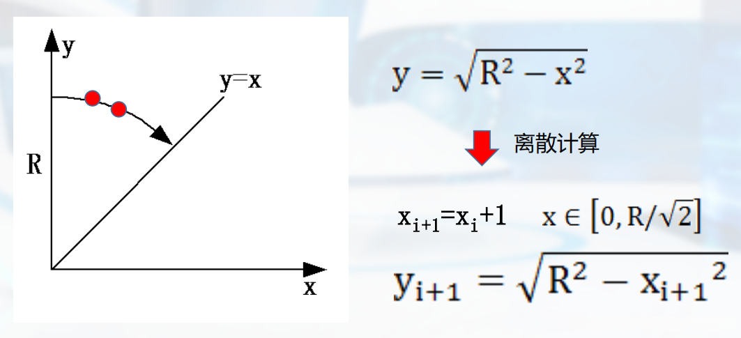 同样地,在简化计算时我们可以仅关注第一象限上半部的八分之一圆周即为所需。为了实现这一目标x每次递增1个单位y依次减去1或保持不变
