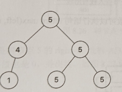 给定问题中的最长同值路径,在试图用函数求解整个二叉树时会面临较高的难度。然而,在处理单个节点时思路则相对明确。因此我们可以将这一复杂的问题拆分为多个较小规模的子问题,并自然采用递归策略进行解决。例如以下所示的二叉树结构可以帮助我们具体阐述递归函数的操作流程